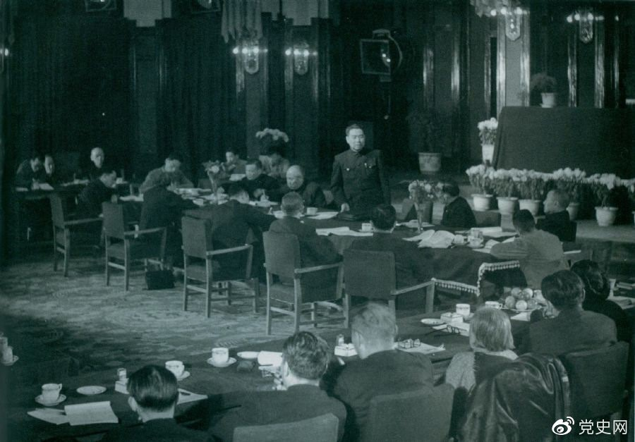 1949年10月21日,周恩來主持召開中央人民政府政務(wù)院第一次會議。正面左起:陳云、董必武、周恩來、郭沫若、黃炎培。